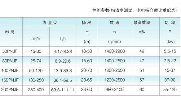 九十年代引进日本技术、研制开发系列渣浆泵,系单级单吸离心式衬胶泵,可输送各类有腐蚀性渣浆及固体颗粒的矿浆。输送矿浆大浓度不超过65%(重量计),温度不得超过100℃,被广泛适用于冶金、矿山、金矿、铜矿、锌矿、铅矿、锰矿、矾矿、石油、化工、煤炭、电力、交通、河流疏浚、建材及市政工程等等工业企业的工况岗位。小型泵采用金属骨及特种橡胶模压成形;大型泵采用活络衬胶,减少维修费用,80PNJF、100PNJF、150PNJF的排出口在270℃范围内可按45℃间隔转不同的方向,在没有特殊说明的情况下,一律为垂直向上出口,泵的旋转方向,为泵盖所示标尖头方向旋转。